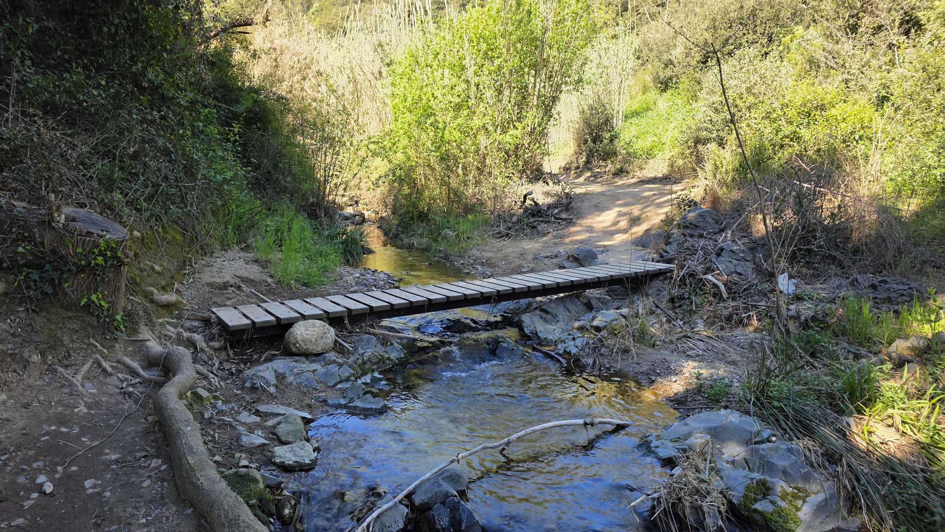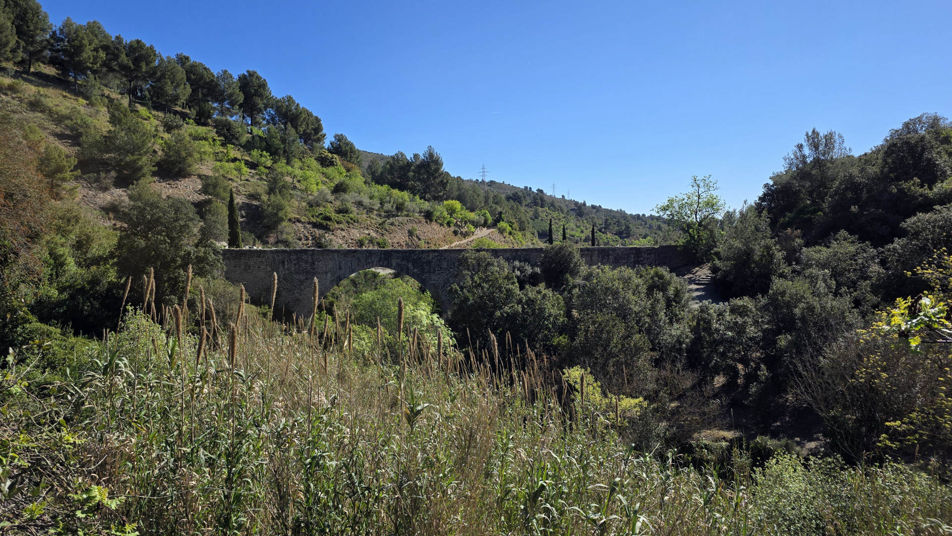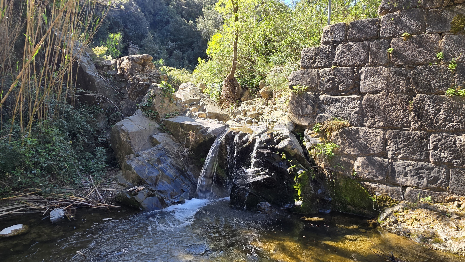 El Camí del Rec sale de la rotonda del Molí del Rovellat, en la entrada de la Selva del Camp, y sigue el trazado de la canalización que abastecía al pueblo desde el siglo XIII. Este camino se utilizaba para el mantenimiento de la canalización que llevaba el agua desde el Mas Ripoll hasta la villa medieval, y cada julio los habitantes de la Selva hacían una excursión popular por el sendero. En los años 80 cayó en desuso con el minitrasvase del Ebro y en 2014 se recuperó para el paseo y la memoria histórica del pueblo. Son 8,5 kilómetros de ida y vuelta con apenas 200 metros de desnivel acumulado, señalizados con franjas verdes y blancas y sin ninguna posibilidad de perderse. El camino arranca entre masías y campos de avellanos y va cambiando de carácter a medida que se aleja del pueblo: los primeros kilómetros son abiertos y luminosos, y a partir del Pont Alt el entorno se cierra, la vegetación se espesa y aparecen las pasarelas de madera que cruzan la riera. El Pont Alt es un acueducto de 1209, doce metros de alto y cincuenta y siete de largo. Más adelante está la Resclosa, el primer punto de toma de agua del siglo XIII, y un poco antes el Pont Sec con las ruinas del Molí del Pont asomando por detrás. Al final del tramo restaurado, siguiendo un poco más, está la Peixera y el Pantanet, un pantano que se empezó a construir en 1739 y se abandonó a los dos años.