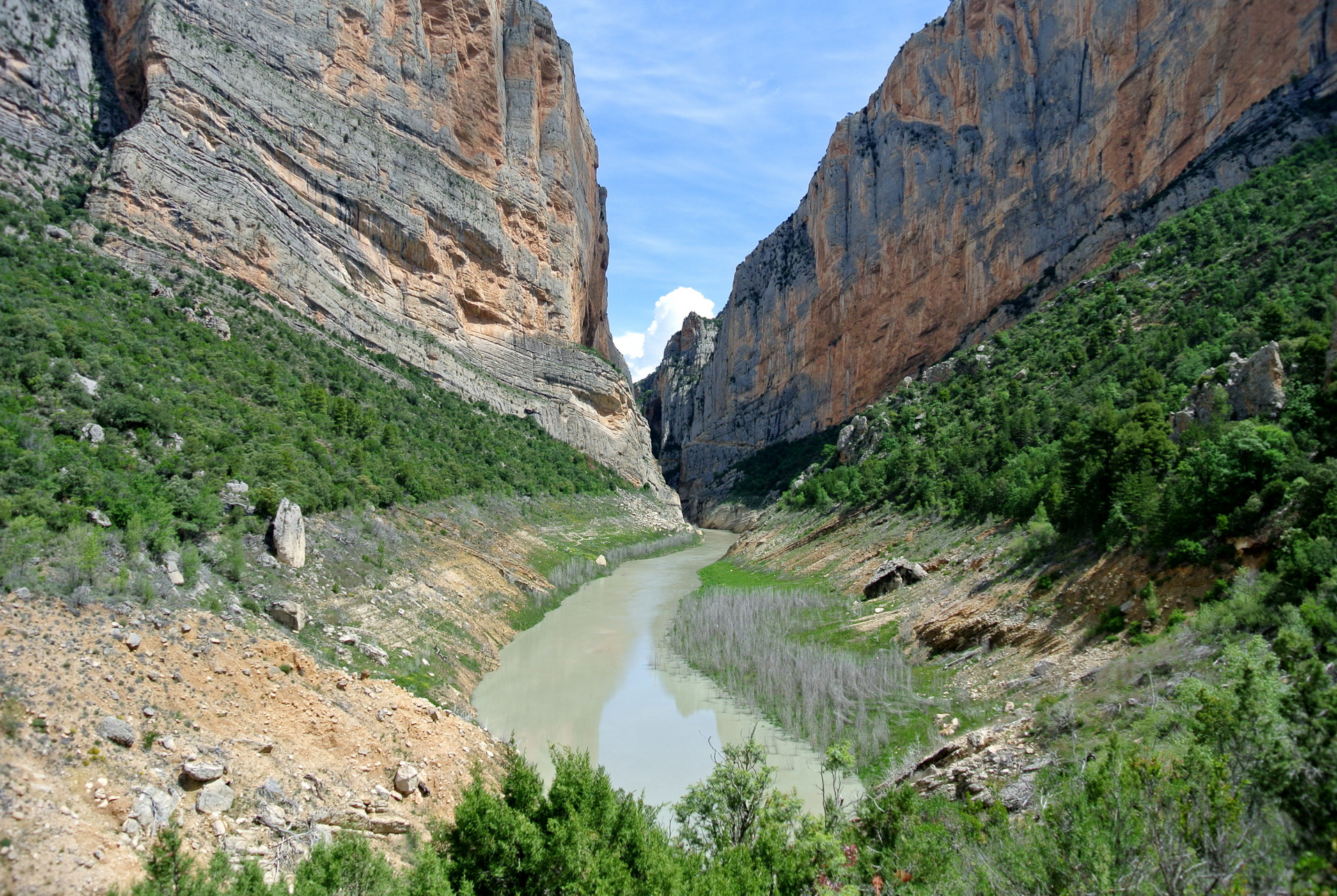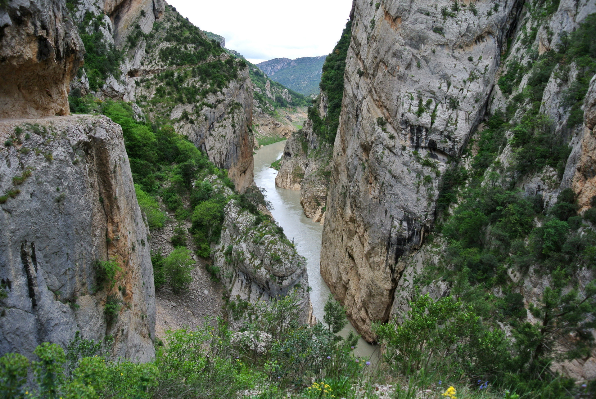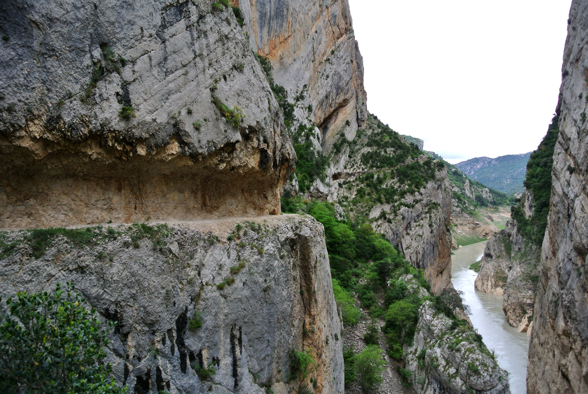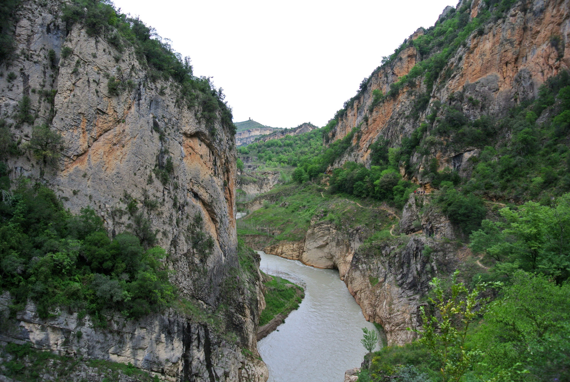 El Congost de Montrebei es uno de esos lugares que parecen sacados de un sueño: un desfiladero natural que separa las provincias de Lleida (Catalunya) y Huesca (Aragón), esculpido por el río Noguera Ribagorçana a través de la imponente sierra del Montsec. Sus paredes verticales de más de 500 metros y la anchura mínima de apenas 20 metros en algunos tramos lo convierten en uno de los paisajes más espectaculares y salvajes de la península.