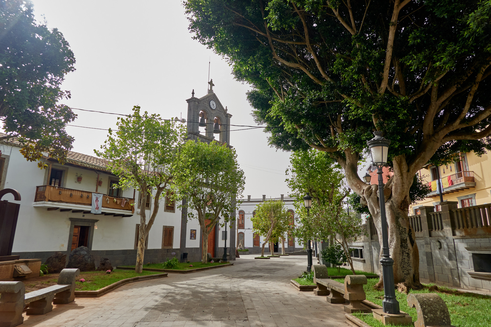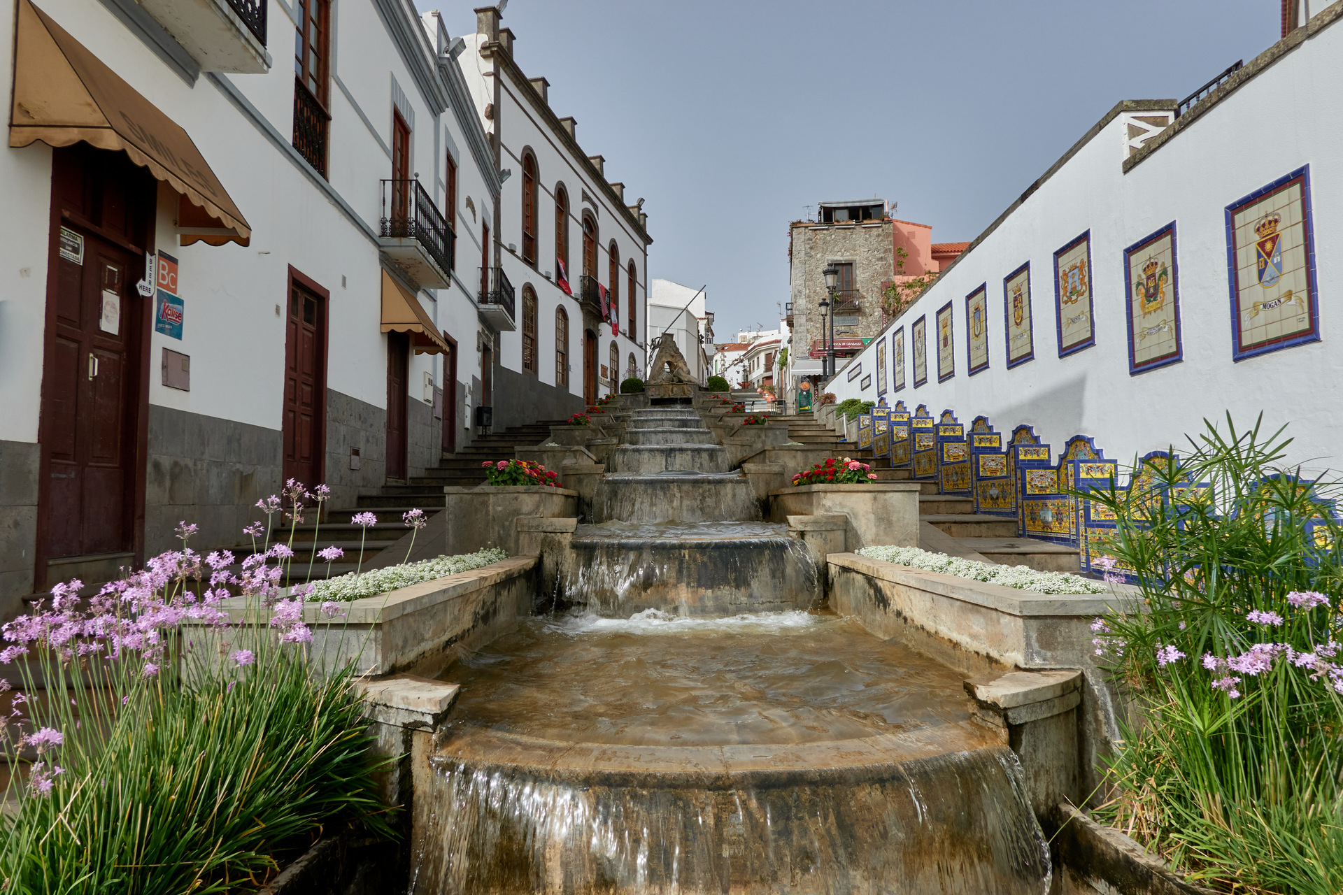 El casco histórico de Firgas es perfecto para recorrer a pie. El famoso Paseo de Gran Canaria y el Paseo de Canarias, antiguos ejes principales del pueblo, hoy son vías peatonales adornadas con una espectacular cascada de 30 metros construida en piedra de cantería. A un lado, los 22 escudos heráldicos de los municipios de la isla y el escudo insular, y al otro, mosaicos cerámicos que representan las islas del archipiélago. Es un rincón fotogénico y lleno de simbolismo, ideal para entender la diversidad canaria en un solo vistazo.