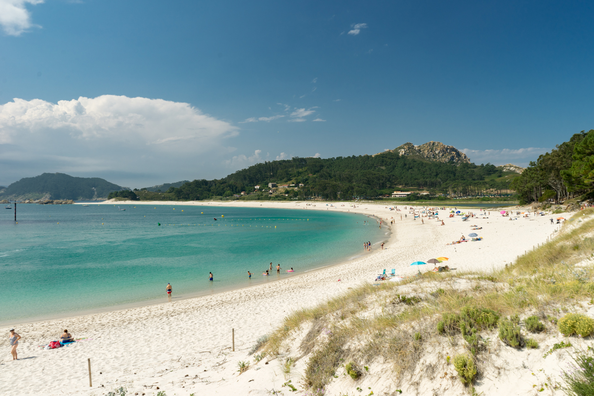 Las Islas Cíes son un parque natural en la costa de Galicia, frente a Vigo, famoso por sus playas de arena blanca y agua cristalina, como la de Rodas. El ferry desde Vigo te deja en pleno paraíso: senderos que cruzan bosque y dunas, miradores sobre acantilados y un ambiente tranquilo incluso en verano. No hay hoteles ni tráfico, solo zona de acampada y chiringuitos con pescado fresco. Ir por el día o quedarse una noche vale igual la pena. Lleva mochila ligera, protector solar y ganas de desconectar.
