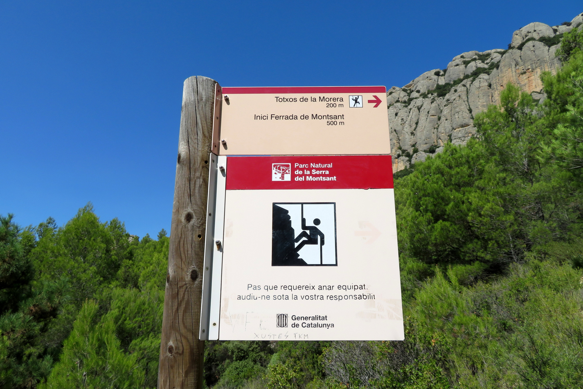 - Aproximación: Desde el aparcamiento de La Morera de Montsant, se accede al inicio de la ferrata siguiendo el Camí de la Devessa y las indicaciones hacia la Seu del Parc Natural. El sendero asciende entre bloques de roca y arbustos, bien señalizado con marcas rojas y carteles informativos.
