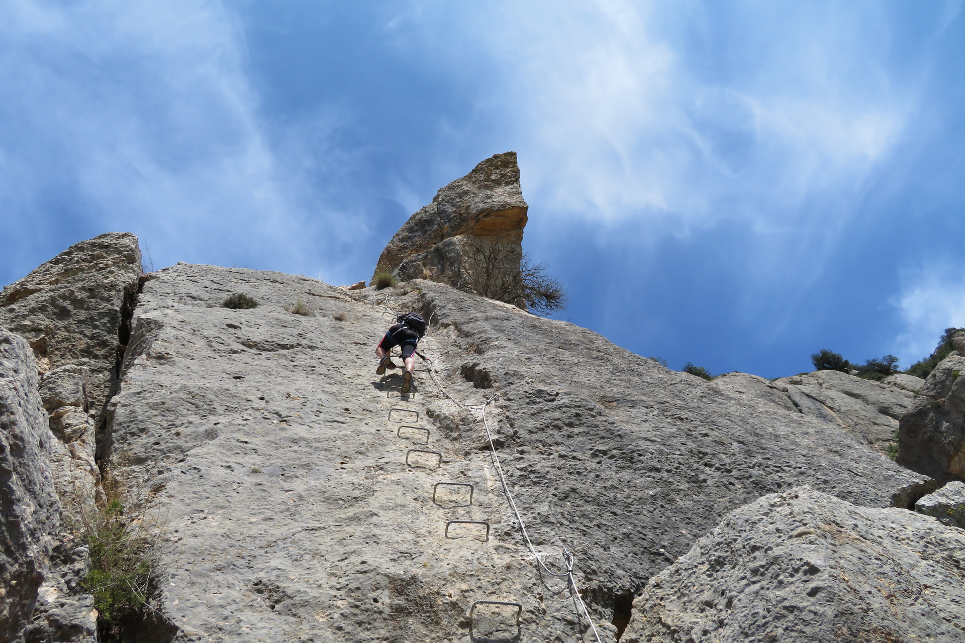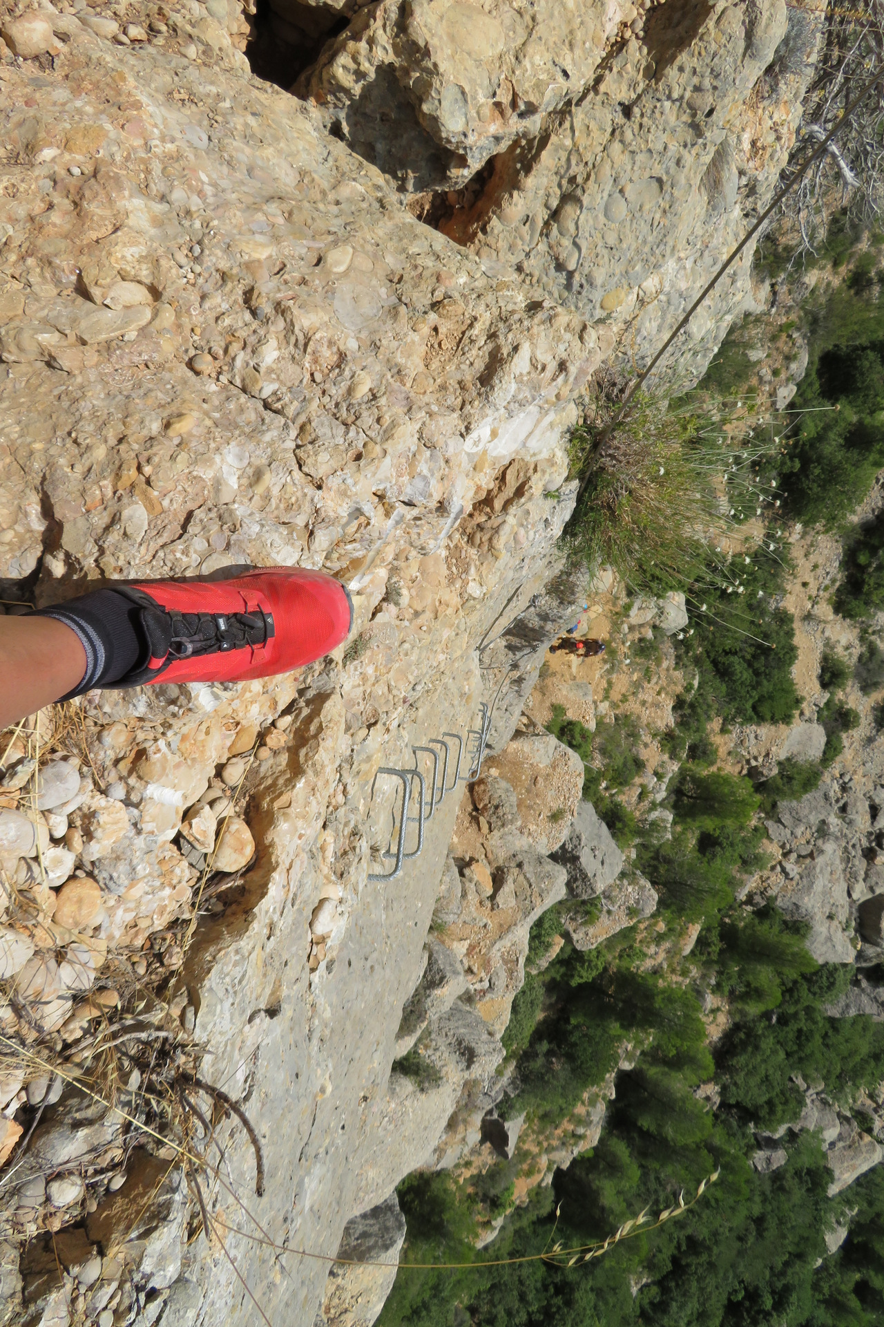- Tramo final: Una última pared vertical equipada con grapas y cadenas lleva hasta la parte alta de la sierra, donde la verticalidad disminuye y el paisaje se abre.